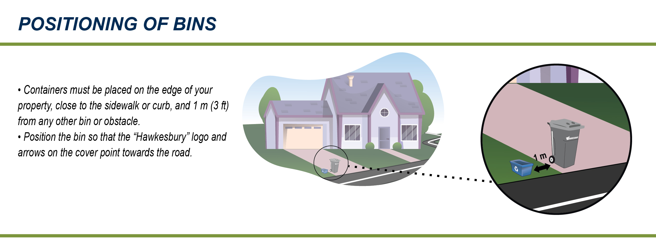 Garbage bins and recycling shall be put on your property slightly set back from the curb or sidewalk, no sooner than 5:00 p.m. the day prior to the collection. The daily collection will normally start at 6:00 a.m. Garbage must be placed in a designated Town garbage bin placed curbside with the logo towards the street.