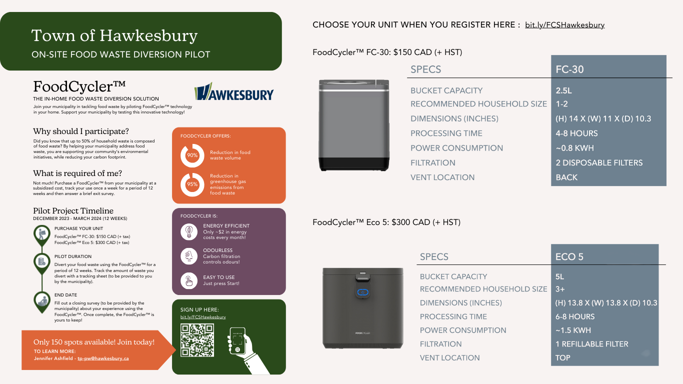 Thanks to a special municipal subsidy, residents of the Town of Hawkesbury can obtain a FoodCycler™ at a discounted price.