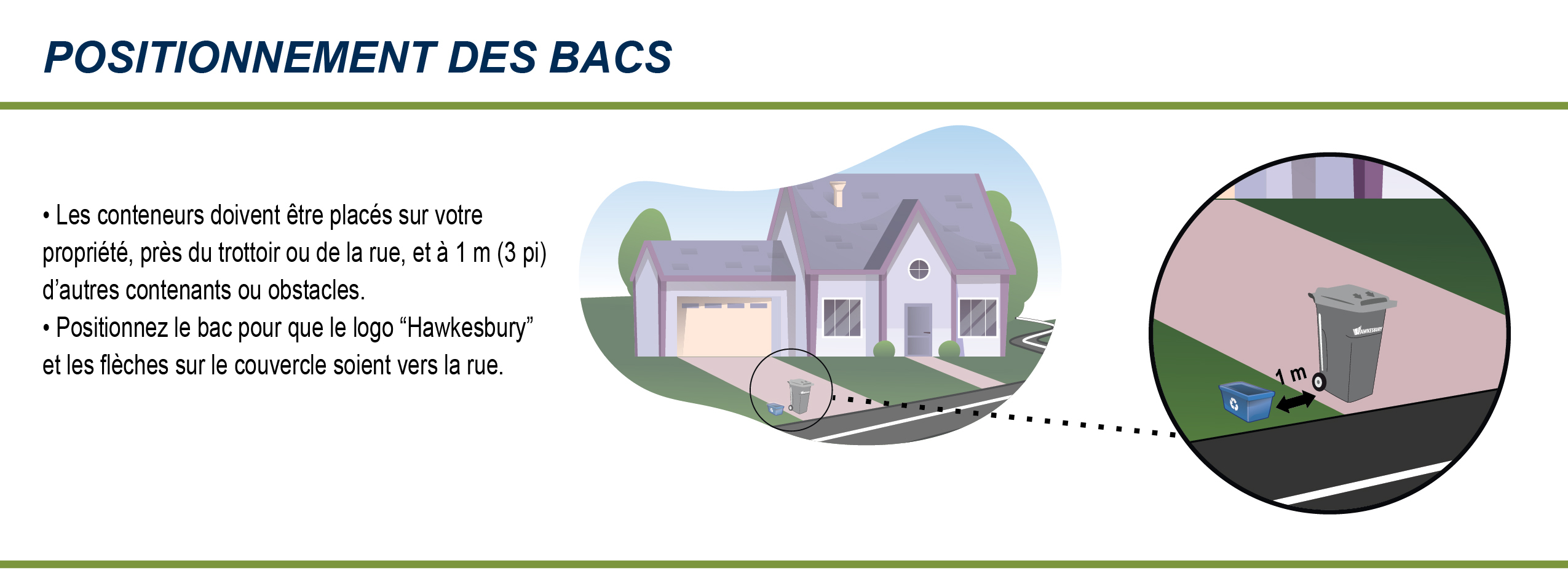 Les bacs désignés d’ordures et le recyclage doivent être déposés sur votre propriété, à la courbe de béton ou du trottoir, pas plus tôt que 17 h la veille de la journée de la cueillette. La collecte quotidienne sera normalement effectuée dès 6 h le matin. Les ordures doivent être placées dans un bac désigné d'ordures avec le logo de la Ville, celui-ci dirigé vers la rue.