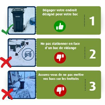 - Gardez une zone sur votre propriété déneigée pour votre bac.