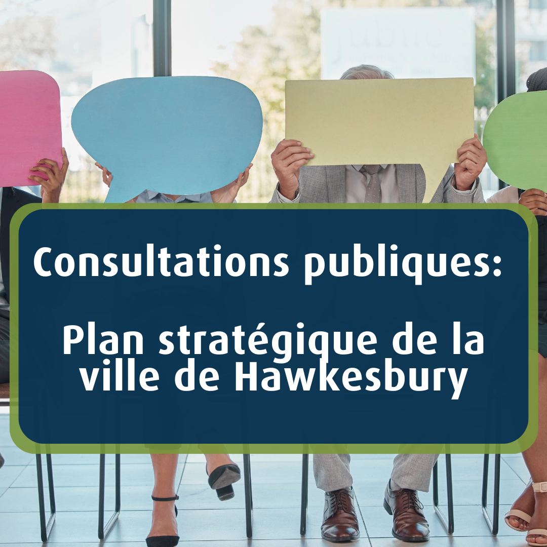 À partir du 22 août, la Ville de Hawkesbury lance une consultation publique dans le cadre du développement d'un nouveau plan stratégique. C'est l'occasion idéale pour vous de contribuer à façonner la vision de votre Ville pour les années à venir.